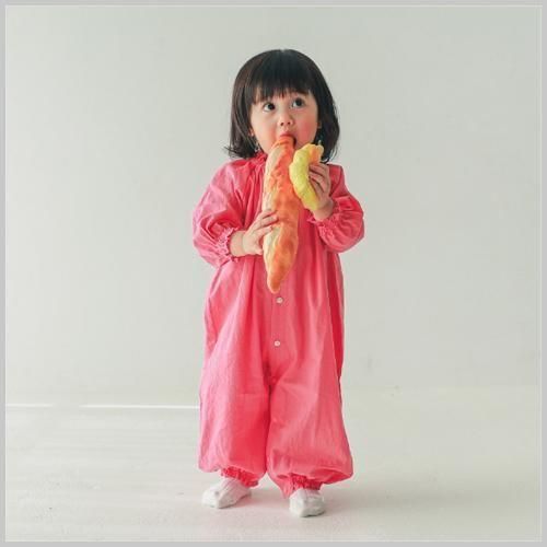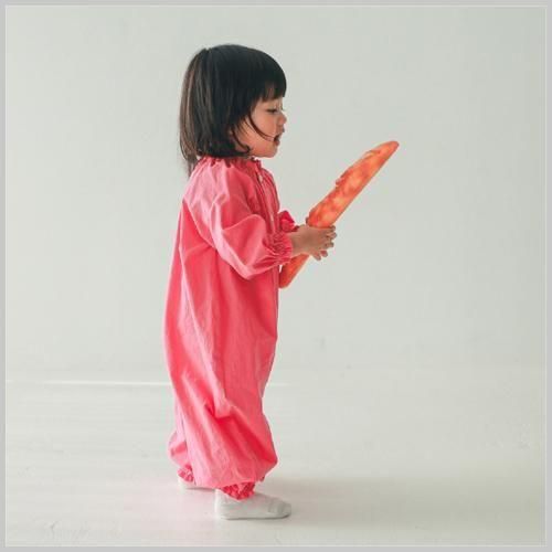 ギャザーによって生まれるふんわりシルエットが柔らかい印象のロンパースです。