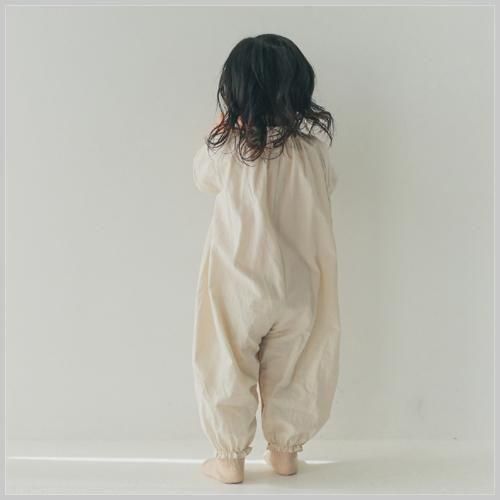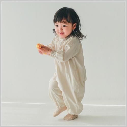 ギャザーによって生まれるふんわりシルエットが柔らかい印象のロンパースです。