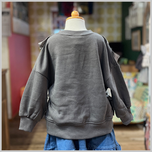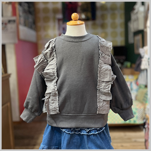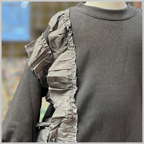 T/C裏毛裏起毛素材を使用した暖かく快適なフリルトレーナーです。フリル部分にはローン素材を使用し、可愛らしさと高級感を演出しています。秋冬シーズンに最適なアイテムで、カジュアルからちょっとしたお出かけまで幅広く活躍します。