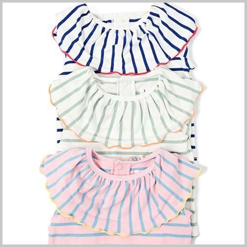 ボーダーに鮮やかなカラーリングのメロウが目を引く、フリルカラーTシャツ。